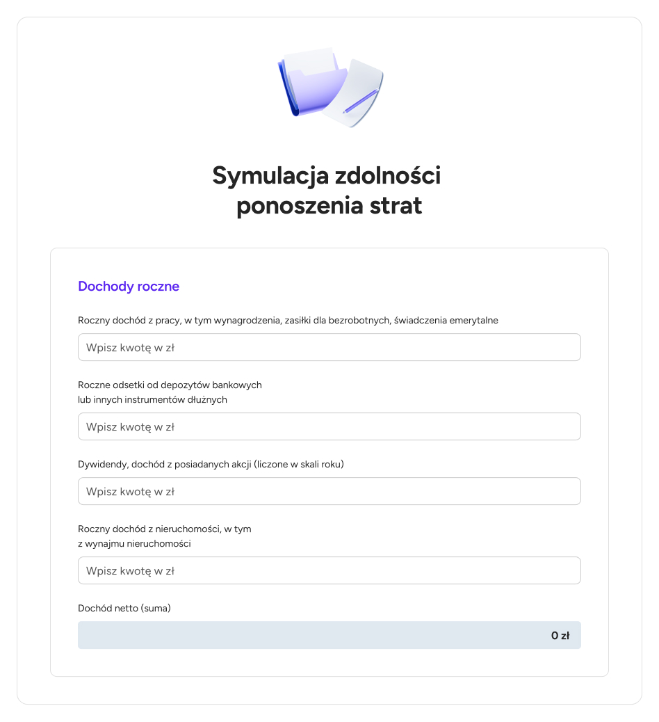 Zdolność do ponoszenia strat to orientacyjna wartość, którą możesz bezpiecznie zainwestować. Przyjmujemy, że wynosi ona 10% Twojego majątku netto – obliczanego podczas krótkiej symulacji.
