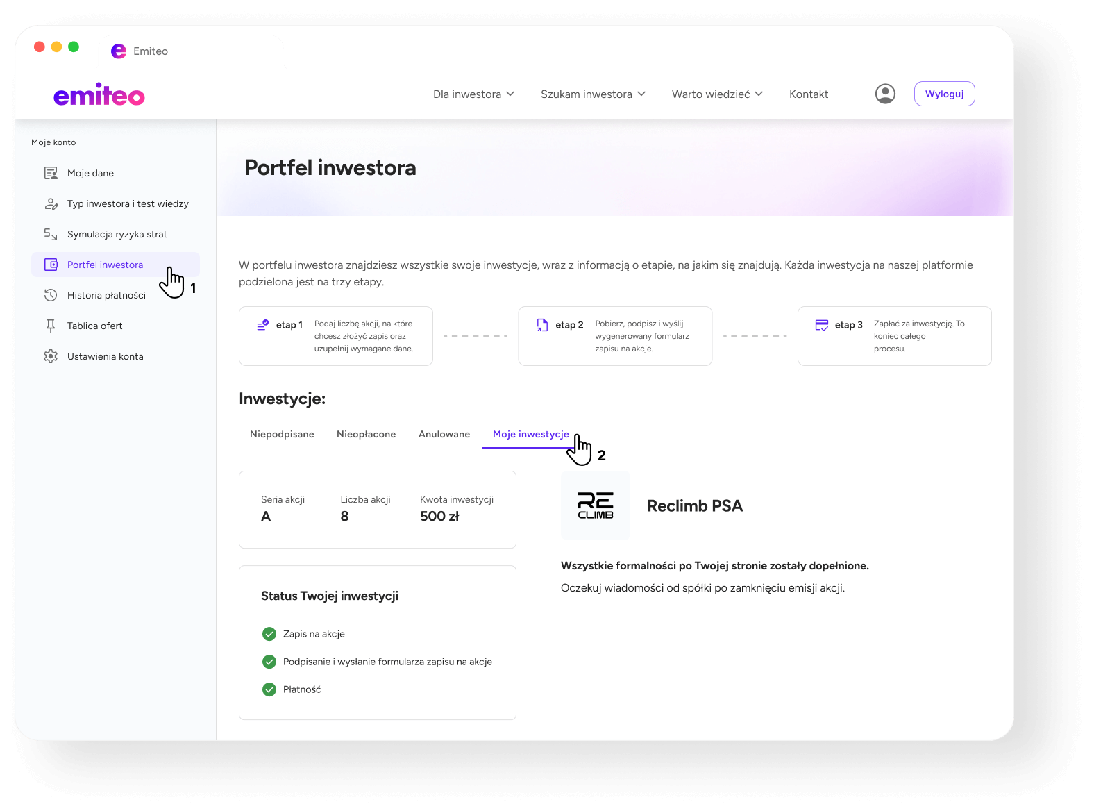 Liczbę i rodzaj akcji, które kupiłeś podczas emisji na naszej platformie, możesz sprawdzić w zakładce Moje inwestycje w PORTFELU INWESTORA, którą znajdziesz w sekcji Moje konto na emiteo.pl.