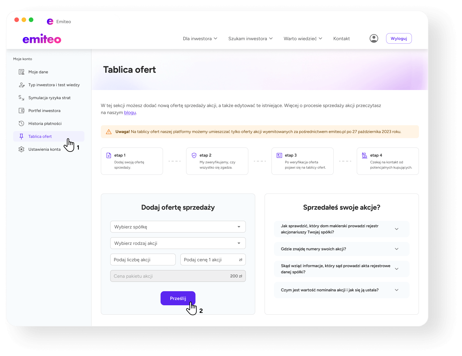 Jeżeli posiadasz akcje spółki, która przeprowadziła emisję na naszej platformie po 27 października 2023 roku, możesz wystawić ofertę ich sprzedaży za pośrednictwem tablicy ofert Emiteo.
