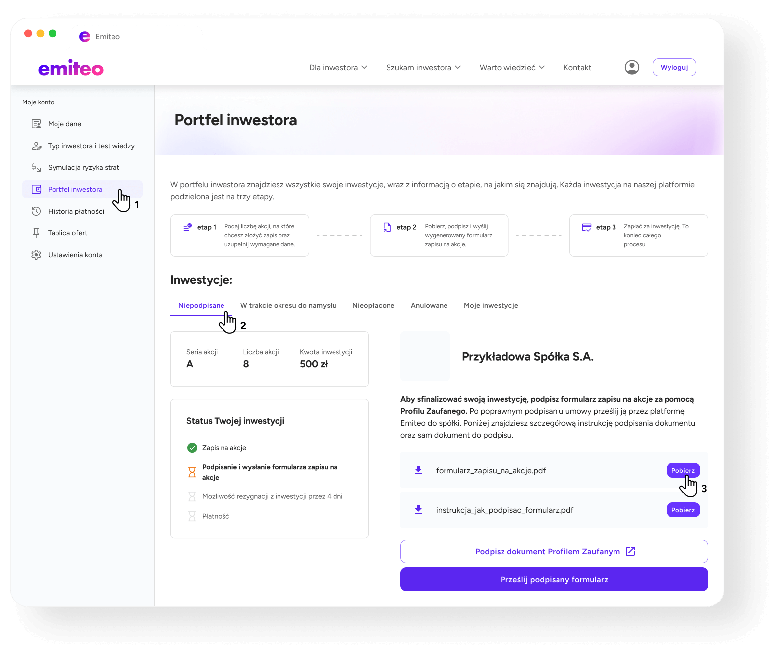 Co więcej, ten sam formularz lub umowę znajdziesz w PORTFELU INWESTORA w Moim koncie, w zakładce Inwestycje niepodpisane.