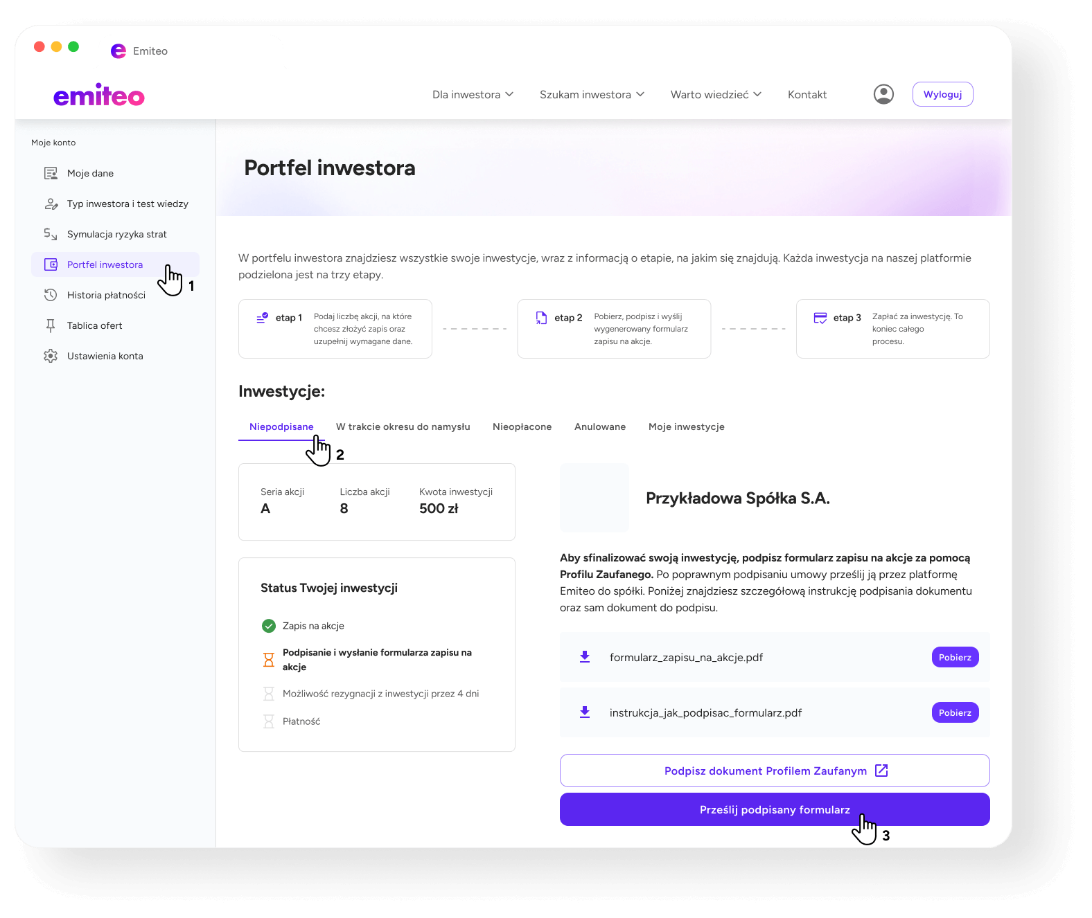 Podpisany Profilem Zaufanym formularz zapisu na akcje (bądź umowę objęcia akcji) prześlij, używając przygotowanego przez nas narzędzia. Znajdziesz je między innymi w PORTFELU INWESTORA w Moim koncie, w zakładce Inwestycje niepodpisane.