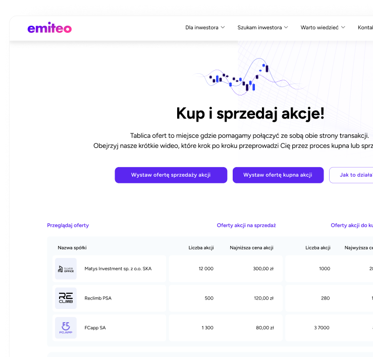 Panel Emitenta do zarządzania bazą w czasie rzeczywistym oraz dostęp do Tablicy Ofert (rynek wtórny dla Twoich akcjonariuszy).